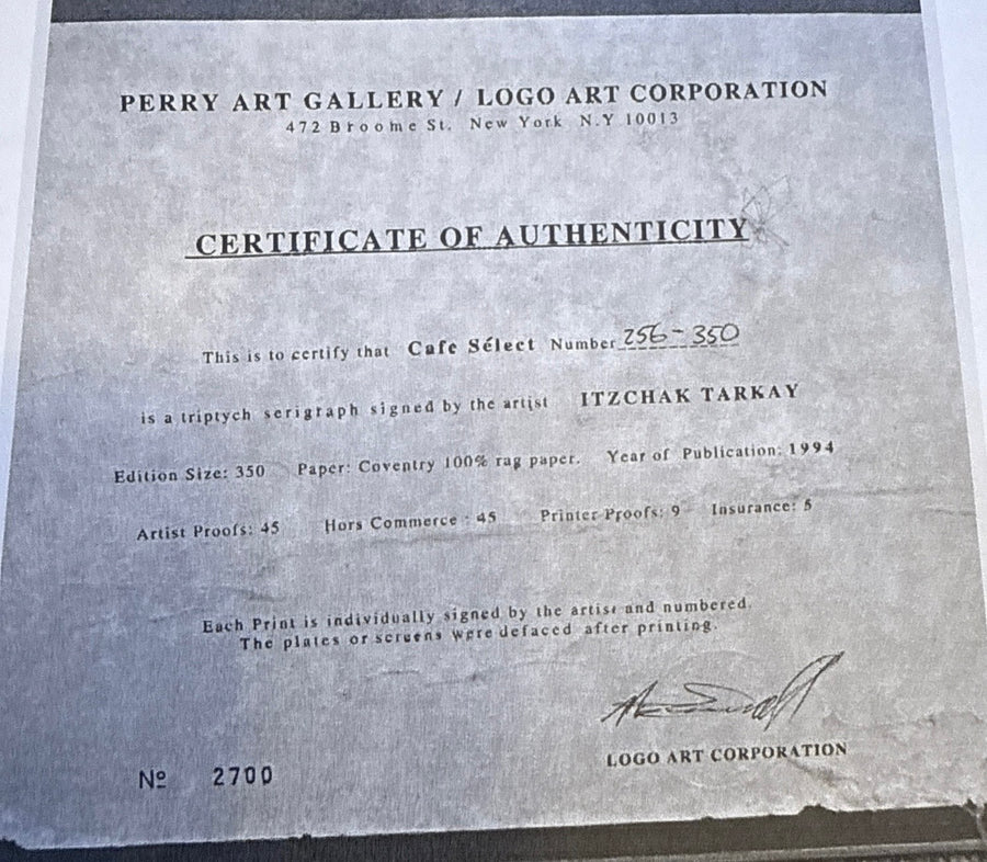 Large limited edition art print from the 1990s. Features a woman in a cafe in an Art Nouveau style and is hand signed by the artist. This serigraph and silkscreen print is made on paper and comes with a certificate of authenticity. The framing adds to the overall aesthetic appeal, making it a standout piece.